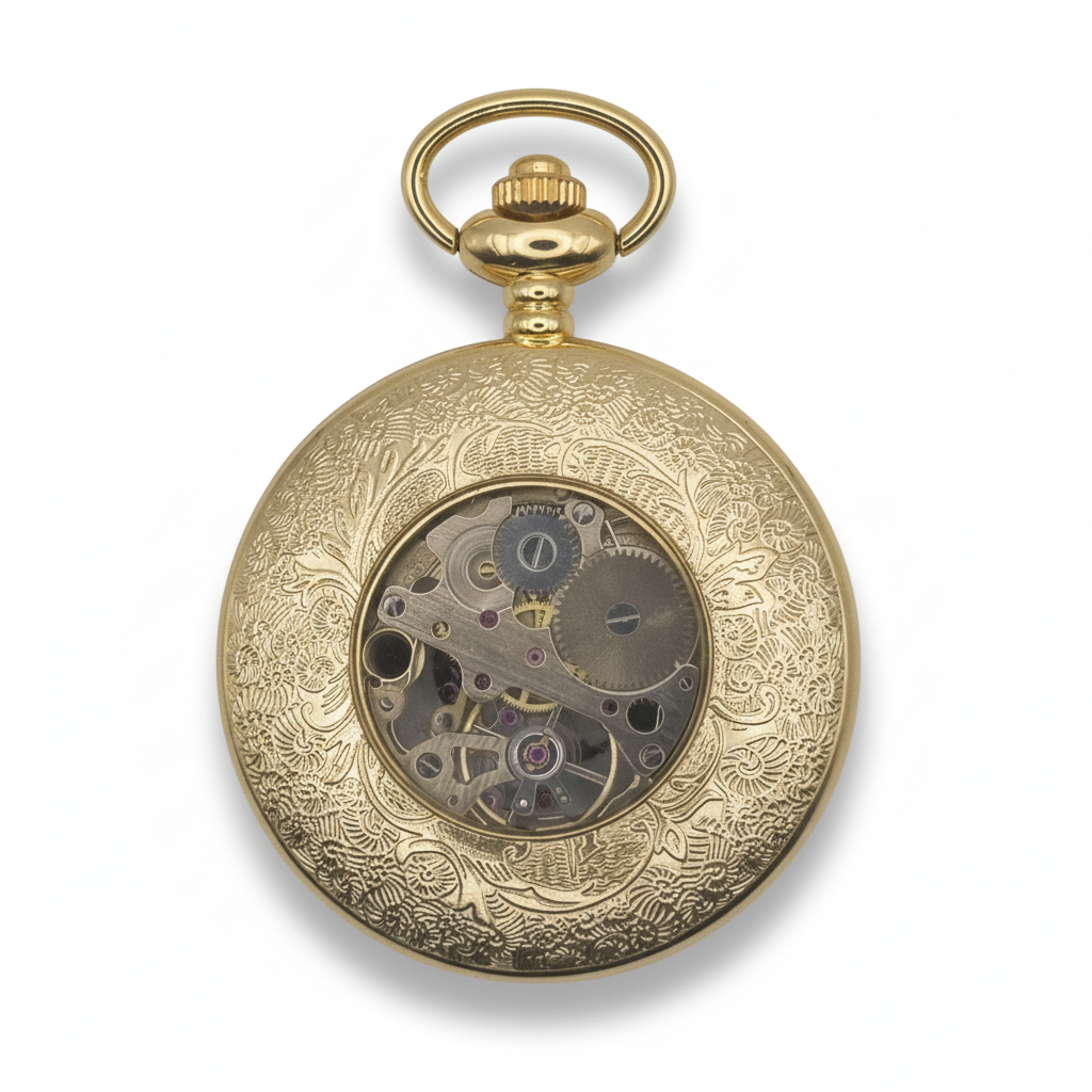 Gold Ringlet Half Hunter Pocket Watch takes a more decorative approach, centred on its gold tone, ringed chapter window. The covered front keeps the traditional hunter feel, while the viewing window adds an extra focal point on the case. That makes it a good fit for someone who notices the small visual details.