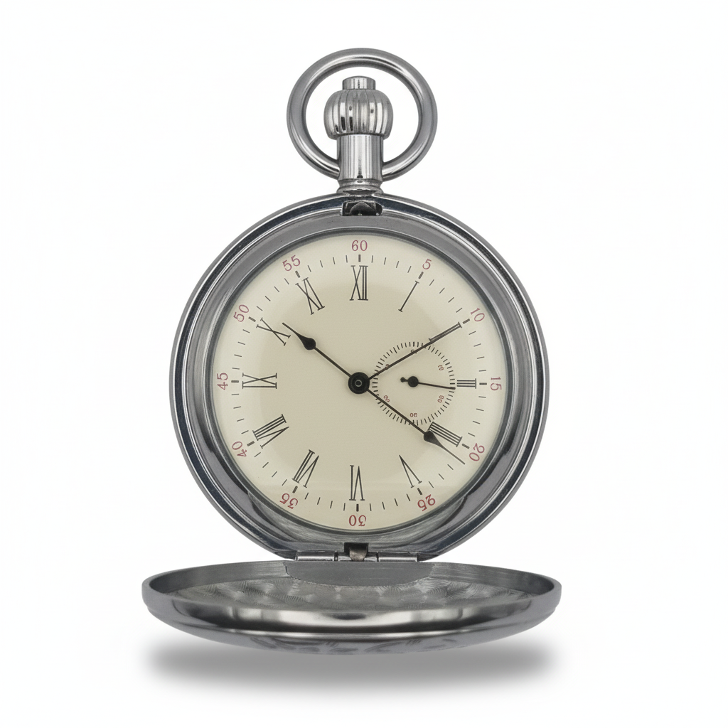 Polished Silver Locomotive Hunter Pocket Watch stands out straight away with its silver tone, polished case. Its closed cover gives the watch a more formal, old-world profile and adds to the sense of ceremony when it is opened. That makes it a good fit for someone who notices the small visual details.